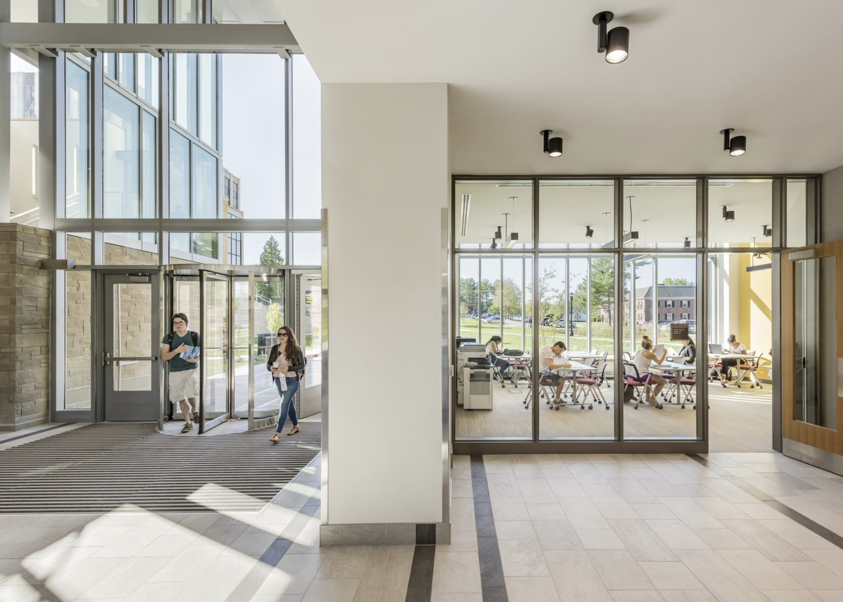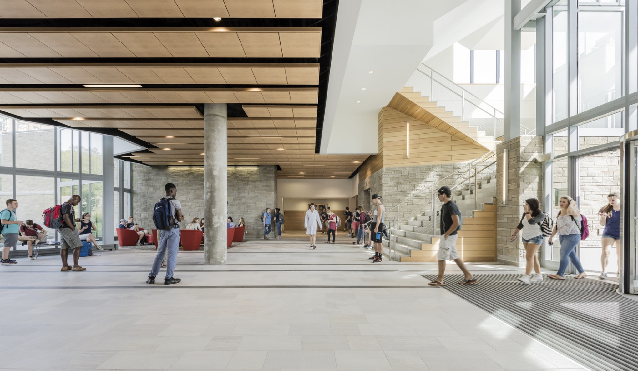 Sited as an architectural gateway, the building actively shapes the campus experience. It connects pedestrian paths from the original campus quad and frames an existing rain garden. The massing reinforces pedestrian flow at this important junction, offering two main entrances. The primary at-grade entrance leads to the lower lobby, general chemistry laboratories, lecture halls, and administrative offices. An upper pedestrian path crosses a new outdoor terrace, providing direct access to the second level, which houses the double-height upper lobby, organic chemistry teaching laboratories, instrumentation lab, and departmental offices.